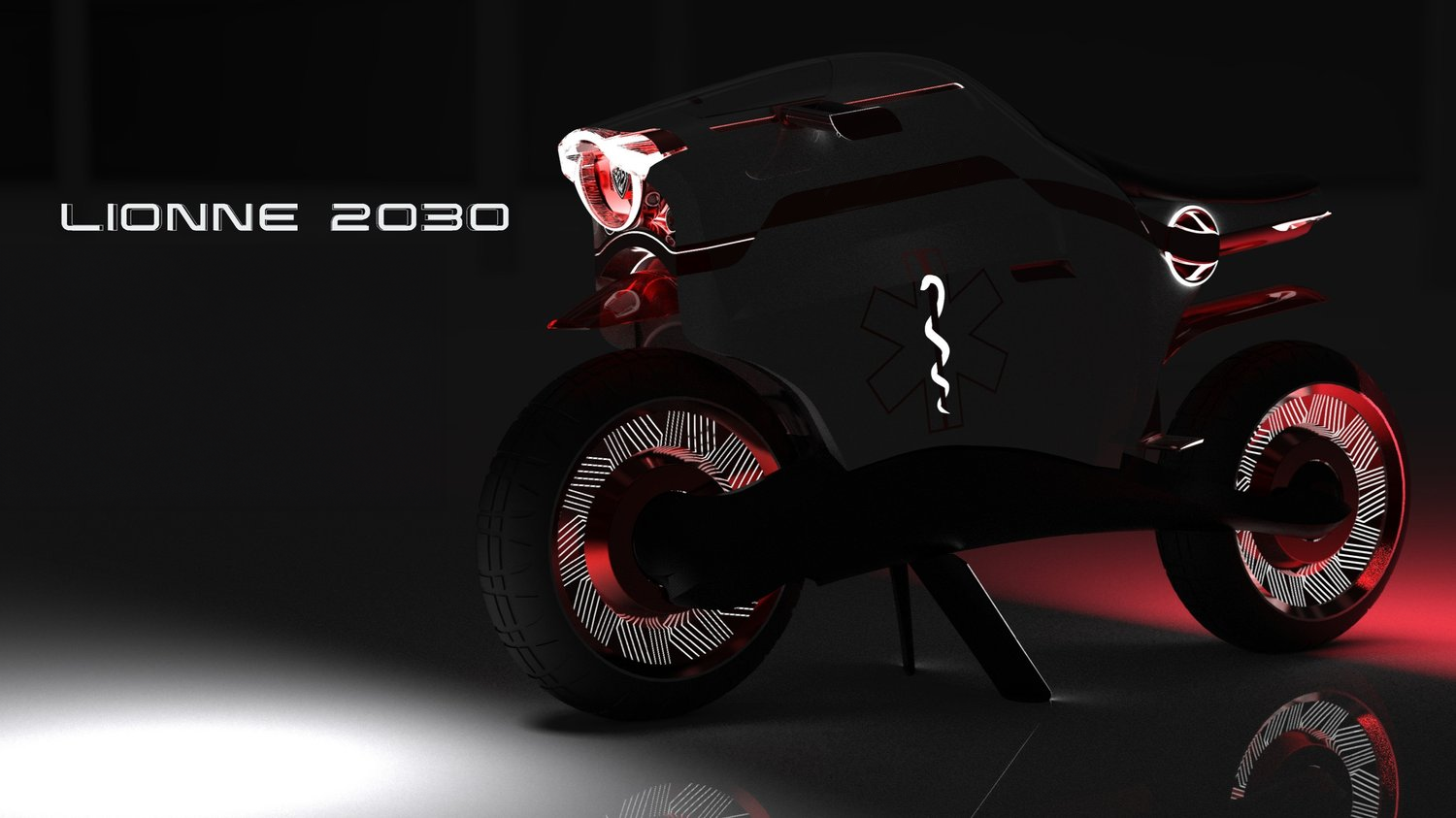 Lionne is a fully electric, autonomous cargo motorcycle for medical first responders in 2030. The vigorous power core and vast cargo space of the high-performance vehicle reference a unique design language. This approach transforms a vehicle into a connected experience with the driver.